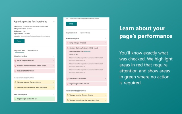 Diagnostic tests tab shows you factors that may impact performances of your page. It can be usefull to know that your custom web part is making too much refresh and impact performances or that Microsoft 365 CDN is not enabled for your tenant. Results are analyzed using pre-defined rules determined by Microsoft, see references at the end of this article to know more about this topic.