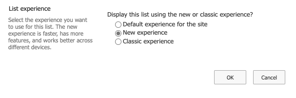 Then click on Advanced settings and go at the bottom of the page to display the List experience section. Check New experience option then click OK button to validate your settings.