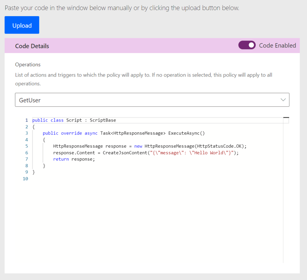 After successfully created the custom connector with the sample code provided by default (Hello World) or a code sample of your choice, you are now ready to test it. If you enable the custom code, this code will have the priority over the codeless operations definition.